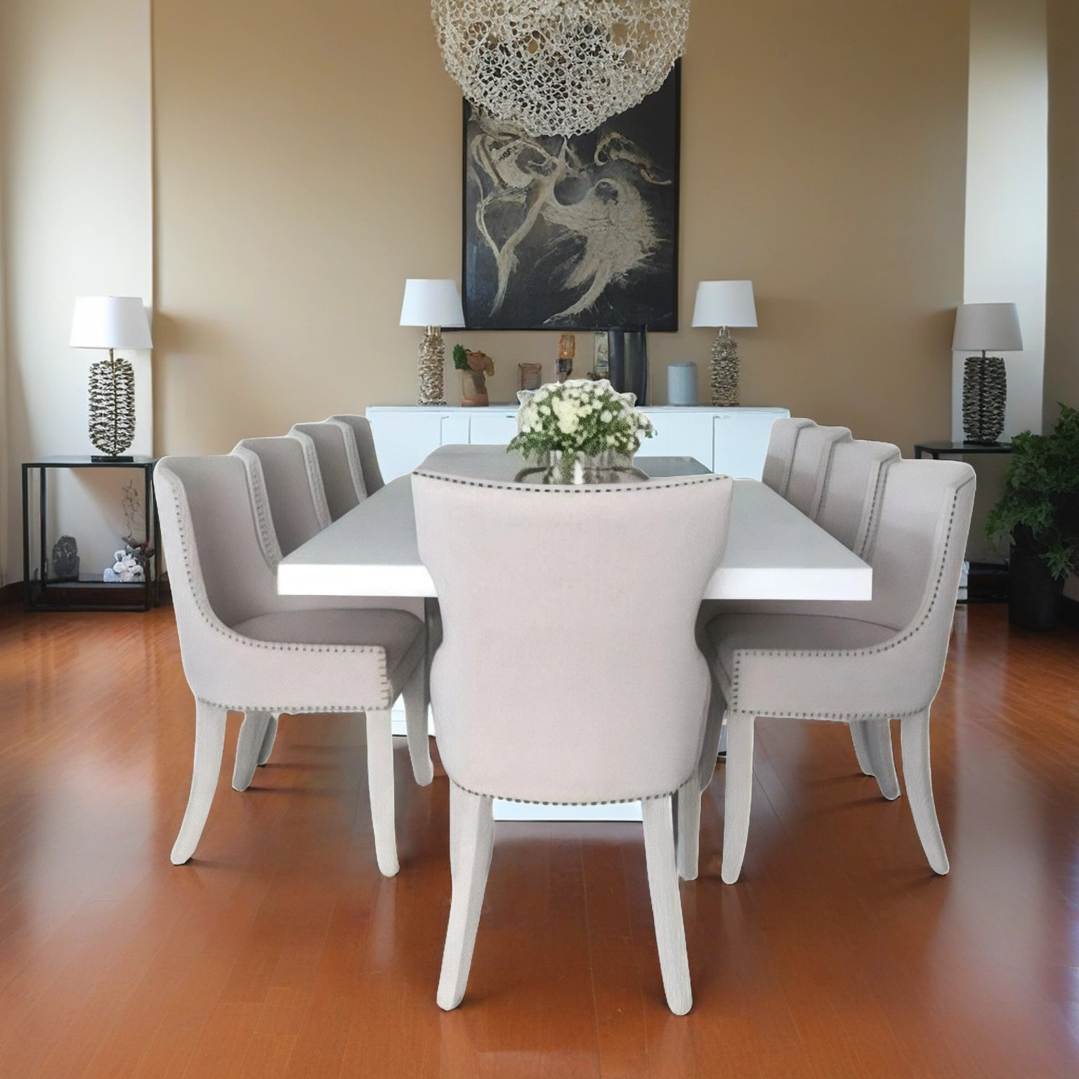 Dining set designed in a style that combines charming classics and modern design, suitable for multiple decorations, made of high-quality wood * Style: Contemporary * Chair height: 85 cm, seat height: 45 cm, seat width: 50 cm Table : 240 * 110 cm * Quantity: 10 chairs + table